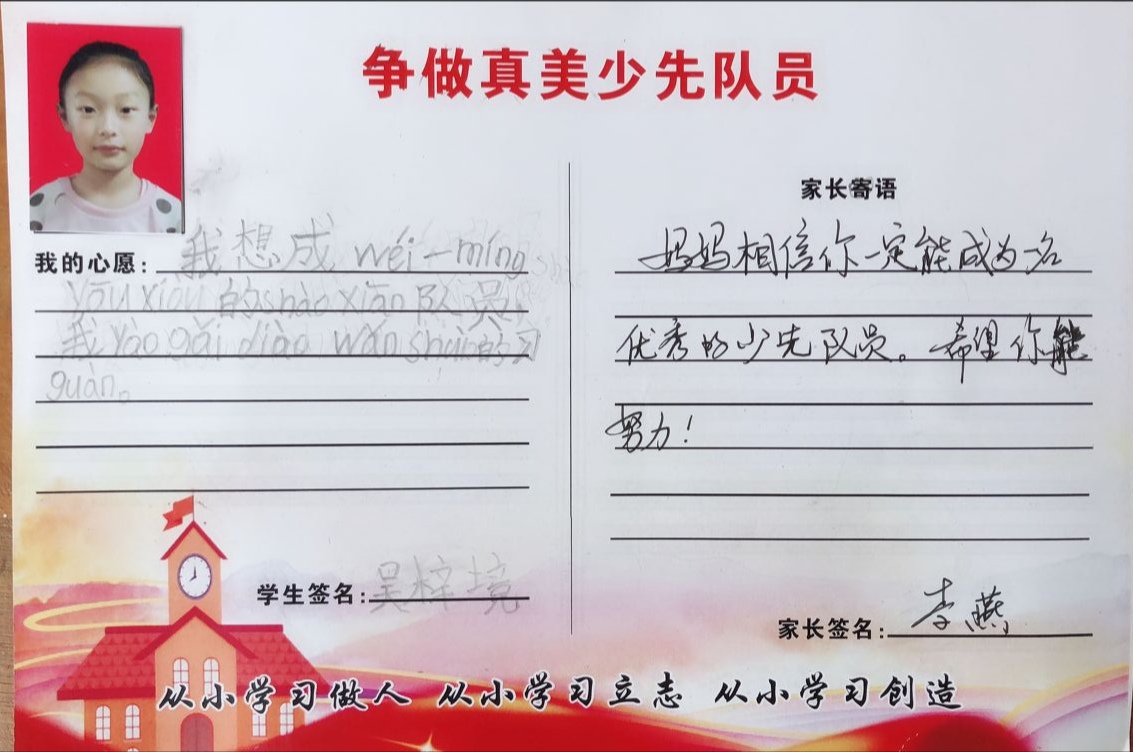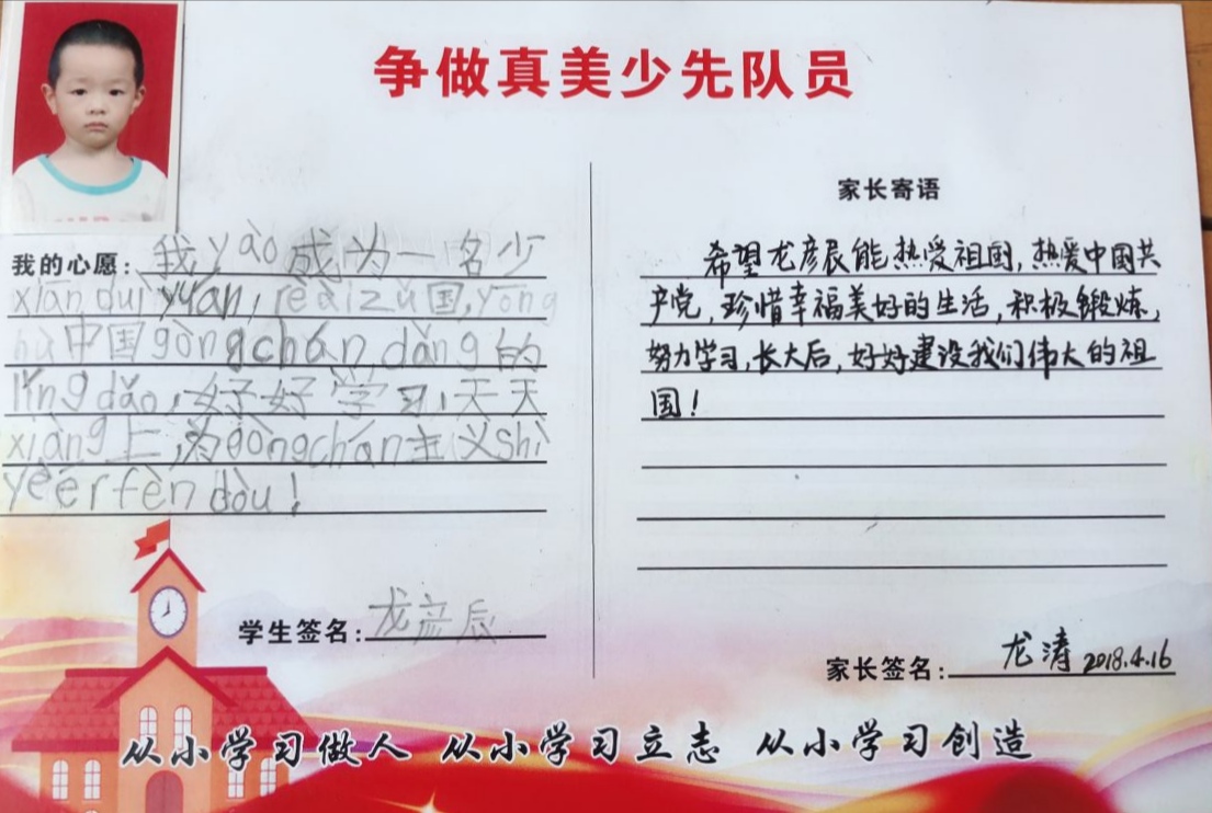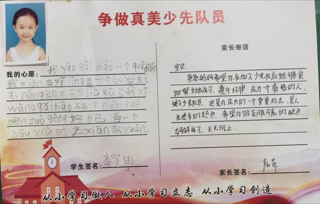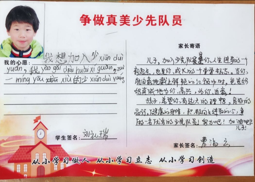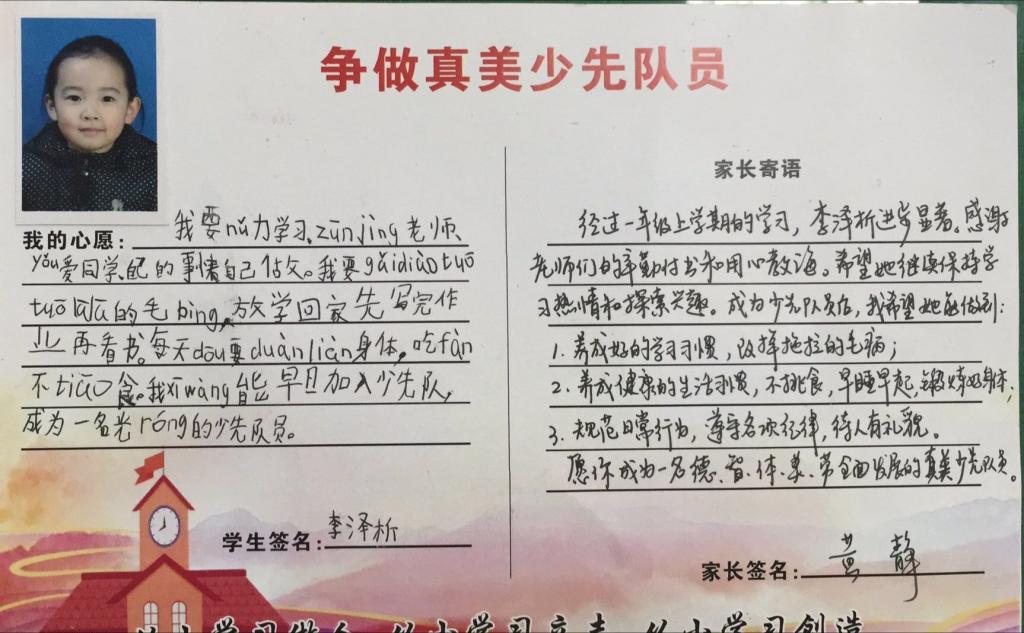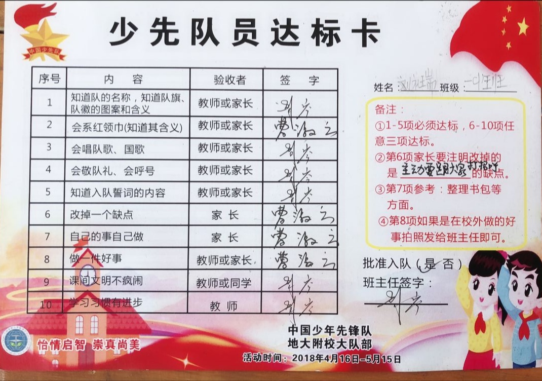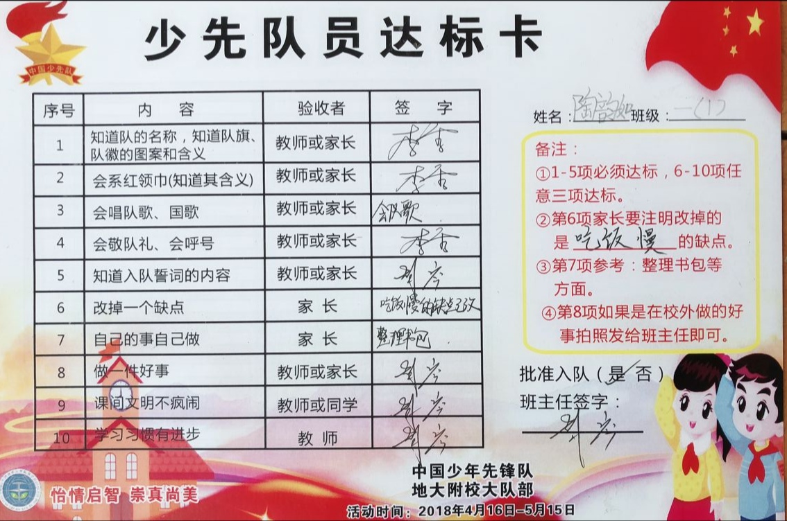 为了让一年级的同学尽快融入少先队的大集体中,前期,学校大队部开展了多次“少先队员十知道”等主题的队前教育班会,在队课上,同学们了解了少先队的历史、性质和任务;在辅导员的指导下,掌握队歌、队礼、宣誓、呼号的正确行动方式;懂得了队歌、队礼、呼号等少先队礼仪的切实含义,借此充分激发了新队员立志成为一名光荣的少先队员的热情,另外为了让所有同学积极参与,大队部还专门设置了入队达标卡,同学们不仅认真学,还脚踏实地地做着。大队辅导员段亚清老师将长达两个月的队前教育做成视频让同学们回顾着,增强了同学们积极入队的氛围。