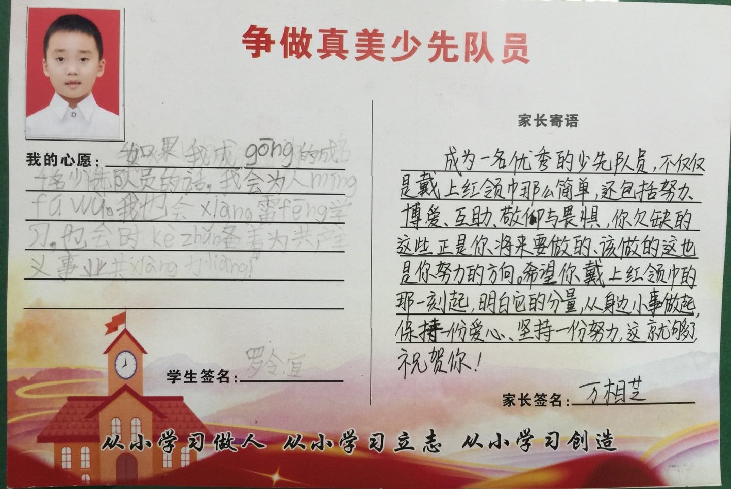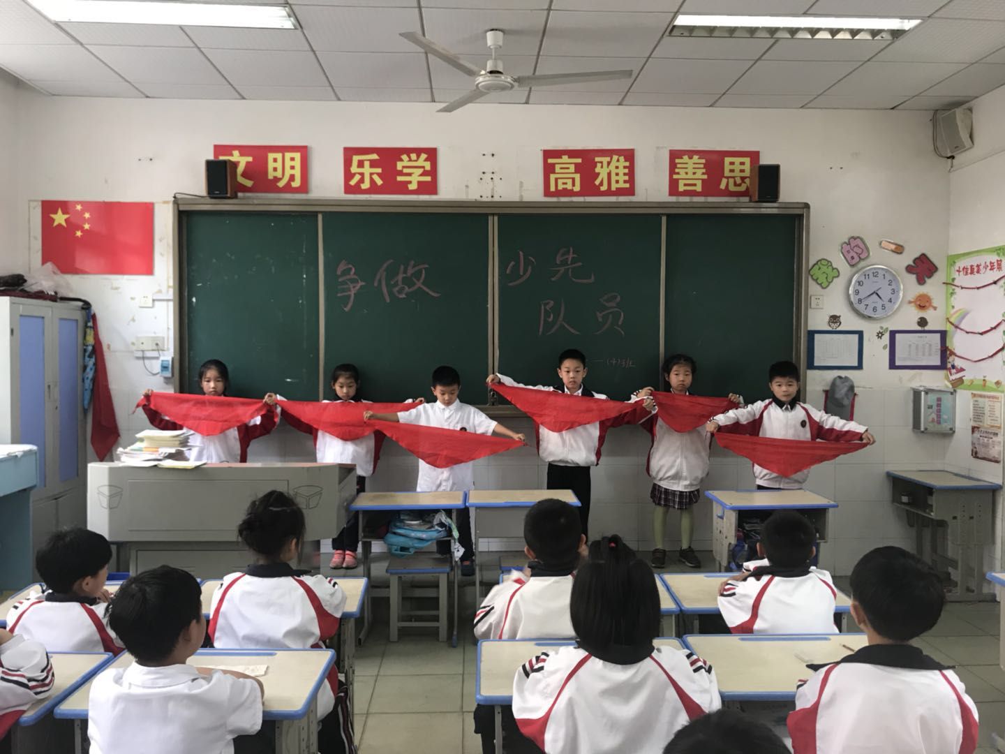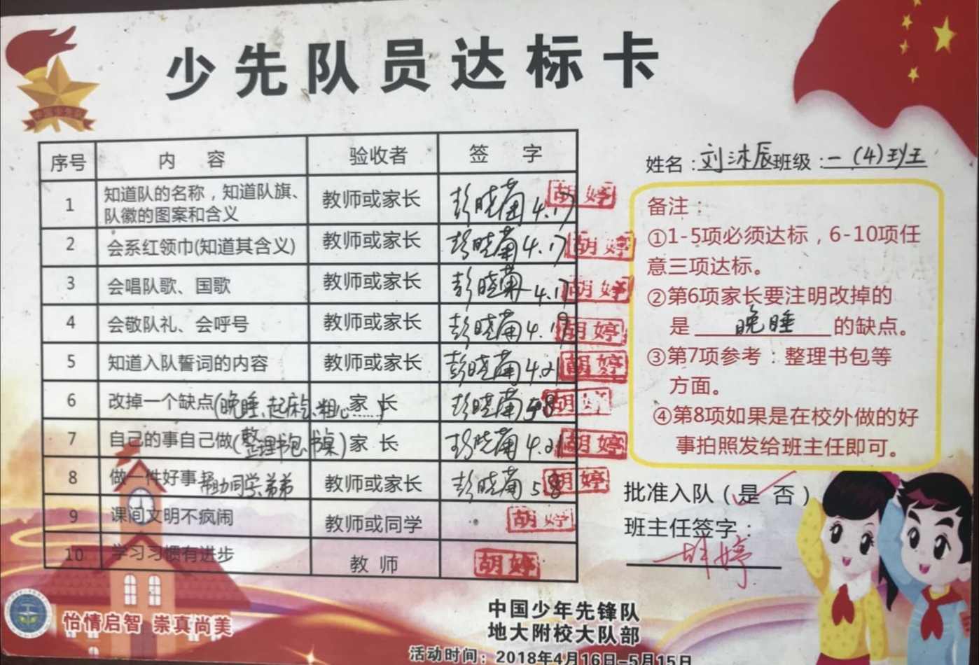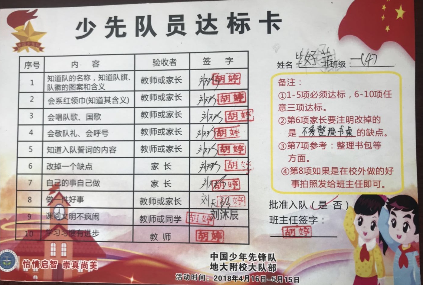 为了让一年级的同学尽快融入少先队的大集体中,前期,学校大队部开展了多次“少先队员十知道”等主题的队前教育班会,在队课上,同学们了解了少先队的历史、性质和任务;在辅导员的指导下,掌握队歌、队礼、宣誓、呼号的正确行动方式;懂得了队歌、队礼、呼号等少先队礼仪的切实含义,借此充分激发了新队员立志成为一名光荣的少先队员的热情,另外为了让所有同学积极参与,大队部还专门设置了入队达标卡,同学们不仅认真学,还脚踏实地地做着。大队辅导员段亚清老师将长达两个月的队前教育做成视频让同学们回顾着,增强了同学们积极入队的氛围。