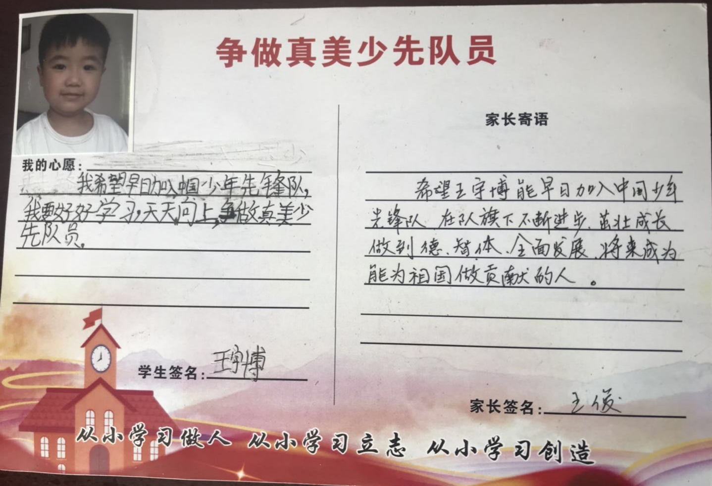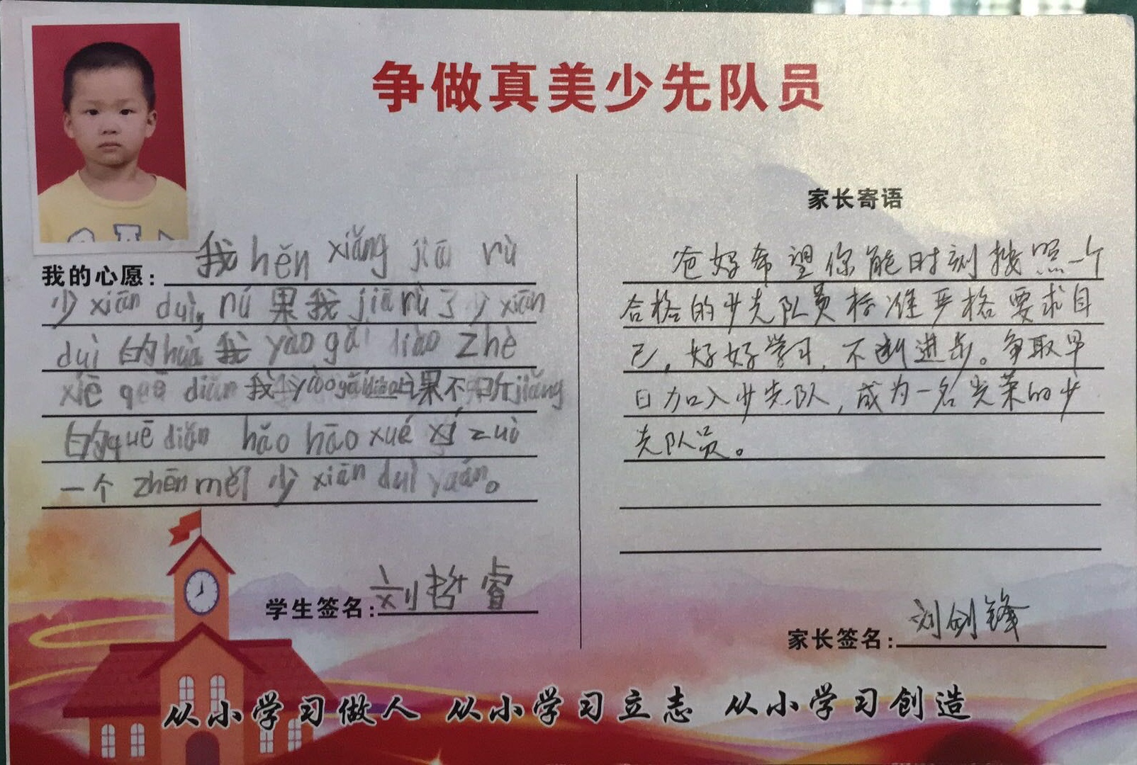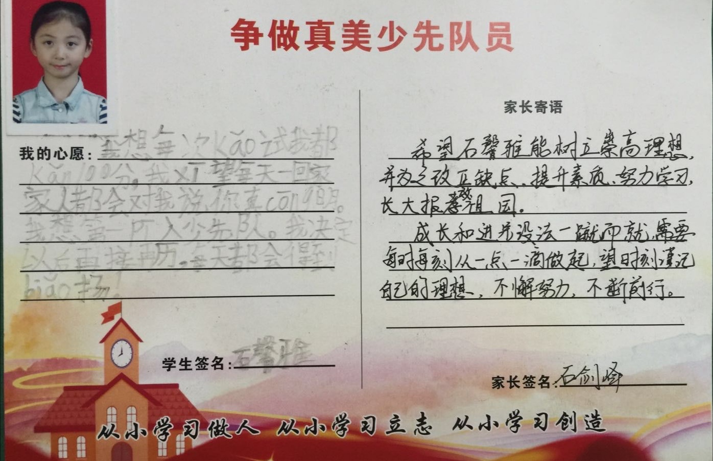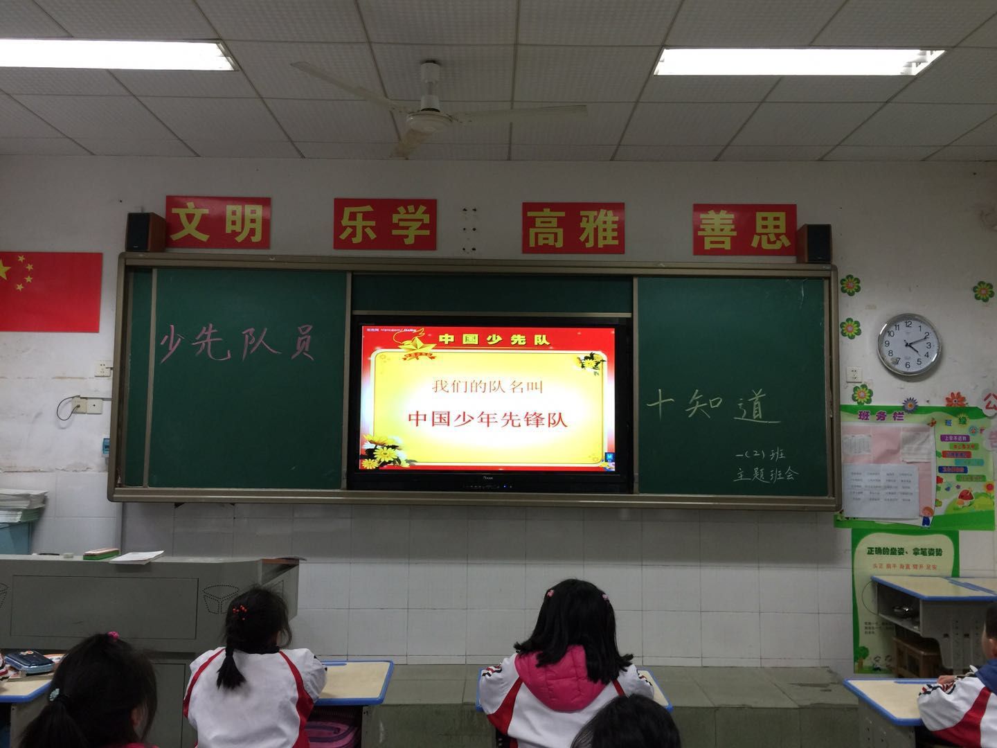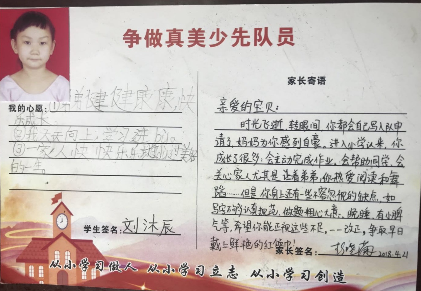 为了让一年级的同学尽快融入少先队的大集体中,前期,学校大队部开展了多次“少先队员十知道”等主题的队前教育班会,在队课上,同学们了解了少先队的历史、性质和任务;在辅导员的指导下,掌握队歌、队礼、宣誓、呼号的正确行动方式;懂得了队歌、队礼、呼号等少先队礼仪的切实含义,借此充分激发了新队员立志成为一名光荣的少先队员的热情,另外为了让所有同学积极参与,大队部还专门设置了入队达标卡,同学们不仅认真学,还脚踏实地地做着。大队辅导员段亚清老师将长达两个月的队前教育做成视频让同学们回顾着,增强了同学们积极入队的氛围。
