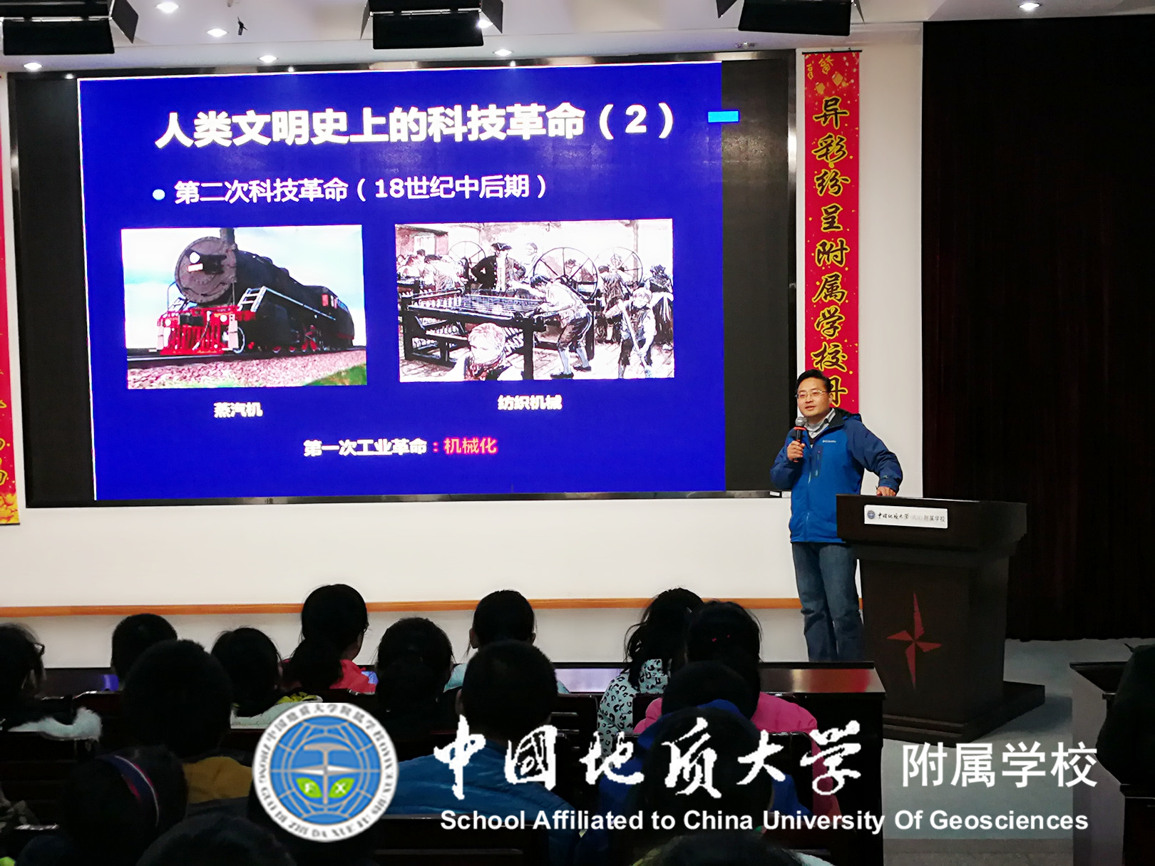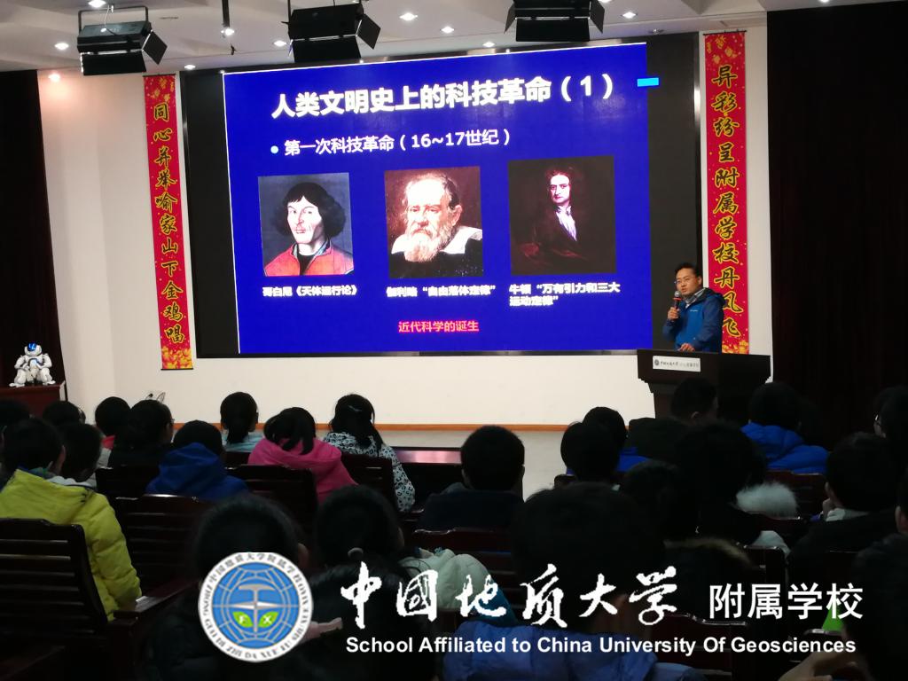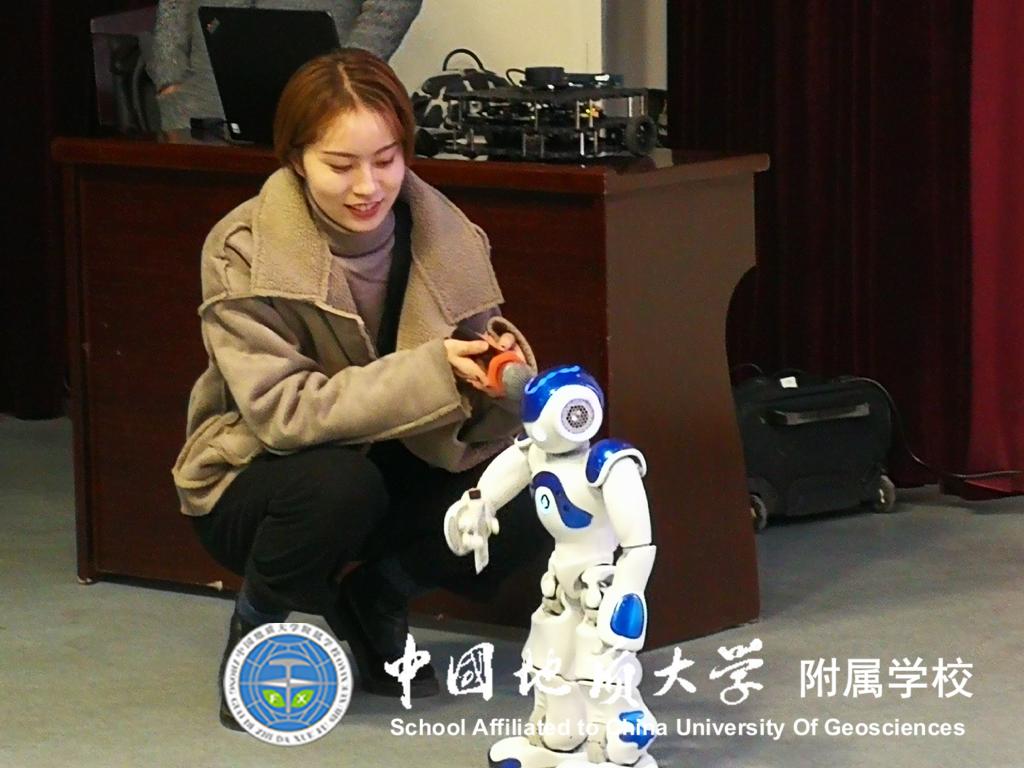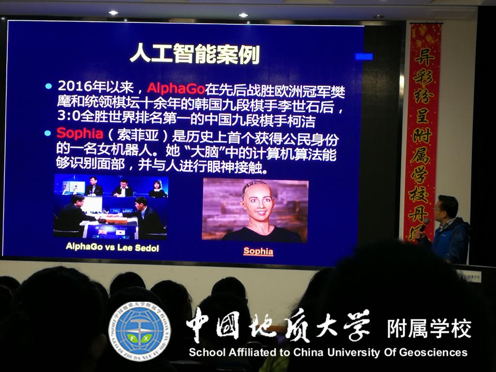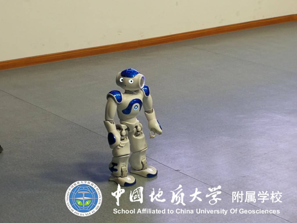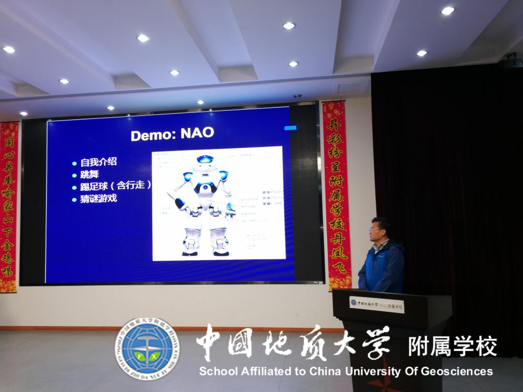 尚老师首先带着孩子们回顾了人类文明史上的五次科技革命,从蒸汽时代到人类正处于的信息时代,尚老师告诉孩子们,人类将在2020—2050年即将进入第六次科技革命,也就是人工智能时代。接着尚老师给孩子们介绍了一些人工智能的案例,如阿尔法go和历史上首个获得公民身份的女机器人Sophia。他给孩子们讲解机器人的分类,并通过视频带领孩子们领略了目前世界上最先进的机器人公司制造的几款先进机器人,孩子们看完视频后对这些先进机器人惊叹不已。尚老师还带来了两款机器人,一款是机器人NAO,这款机器人可以接收来自人类的指令,NAO在现场给师生们来了一段火热的韩国舞,还做出各种动作让孩子们猜是什么运动。还有一款智能绘图机器人,绘制了现场的地图。最后尚老师告诉孩子们机器人涉及的知识就包括我们中学生学习的物理、化学、数学、语文等学科知识。尚老师激励孩子们努力学习,为迎接即将来临的第六次科技革命储备知识和能力,将来成为出色的人才。