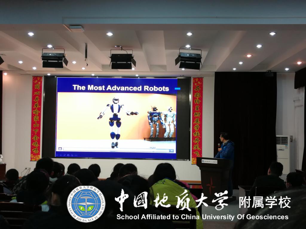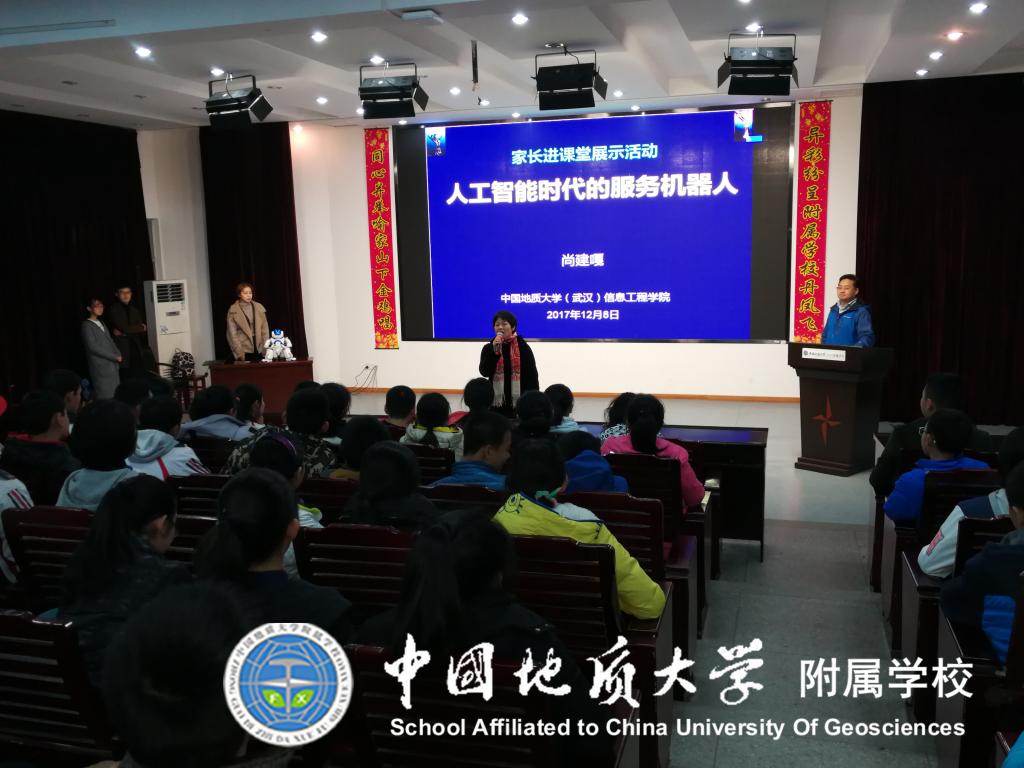 2017年12月8号下午第三节课,bet365官方备用网站八年级有幸邀请到了八(1)班尚霄同学的家长地大信工学院尚建嘎教授,中学部教导主任张莉老师在讲座前给孩子们介绍了尚教授和讲座的主题。尚老师给孩子们上了一堂精彩的展示课,主题为“人工智能时代的服务机器人”。尚老师精心备课,课堂趣味横生,不仅增长了孩子们高科技领域的知识,更让聆听讲座的全体师生享受了一场科技与机器人的盛宴。