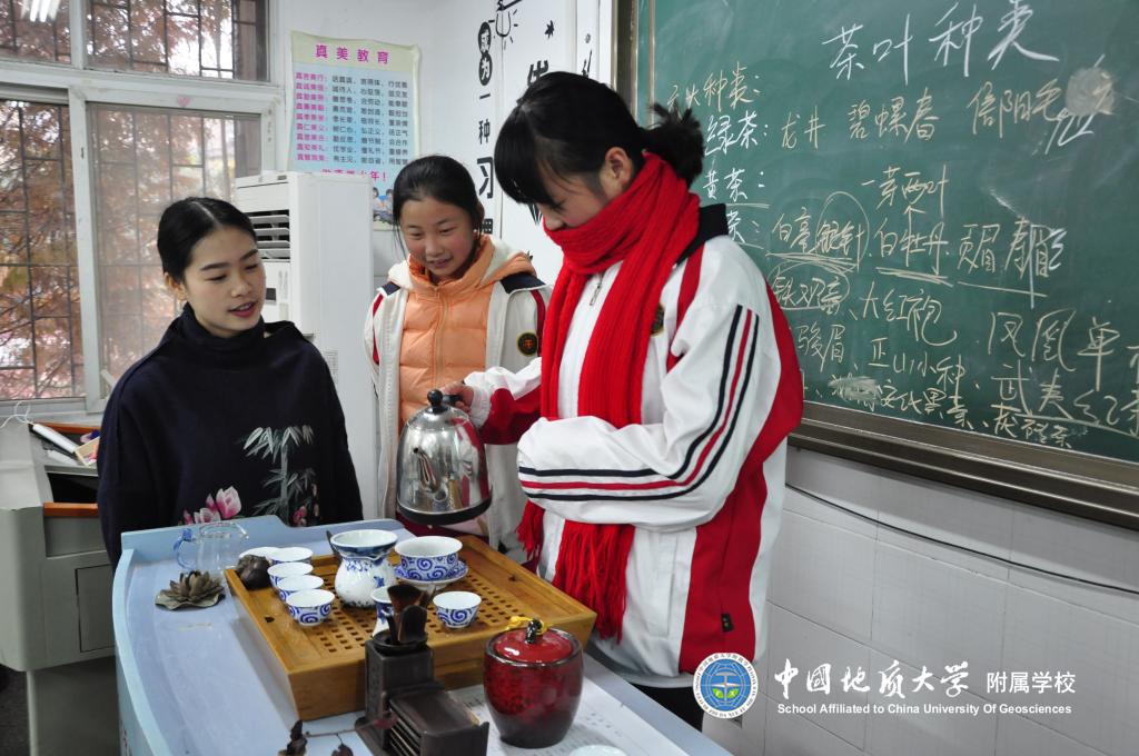 为了使同学们更深入了解中国的传统文化,七(1)班王劲博同学的妈妈和她的朋友们给同学们上了一堂关于茶文化的课。首先,她们向我们介绍了茶叶的类别,接着向我们介绍了茶具,在了解完大概的茶文化之后,老师就开始给我们演示“功夫茶”的泡法。老师给全班同学都倒了一杯茶,让大家品尝。最后,老师叫了几位同学上台亲身体验泡“功夫茶”,这节课圆满结束。