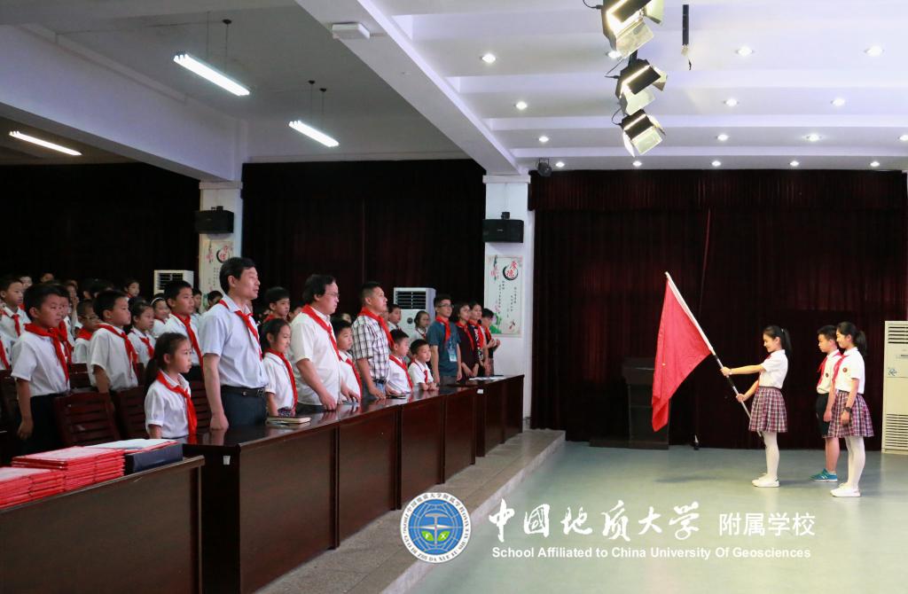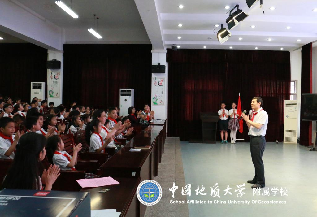 地大附校黎义波校长讲话,他再次对地大图书馆的老师们表示衷心的感谢,肯定了此次活动对队员们的教育作用,勉励大家阅读更多的经典书籍,他还提到我们读书的意义及为什么要读书,鼓励队员们多读书、读好书、好读书。