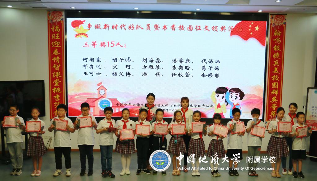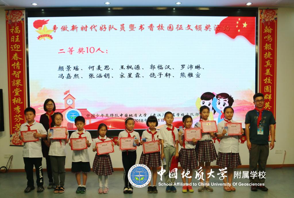 (通讯员:段亚清)为了更好地营造书香校园,倡导多读书、读好书的精神风貌,进一步促进队员们素质的提高。2018年4月23日第23个世界读书日,中国地质大学图书馆携手地大附校三年级172名队员开展了以“读书伴我成长 让理想展开翅膀”为主题的系列活动。参观结束后三年级队员开展了书香校园征文投稿活动,在辅导员及地大图书馆的协力合作下将稿件进行了评比及网上投票,于5月21日下午在地大阶梯教室四楼举行书香校园征文颁奖活动。